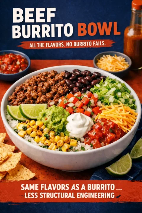Everything you’d put in a burrito but in a bowl. Same flavors, less structural engineering. A burrito bowl is the deconstructed version of a burrito — all the same components, layered in a bowl, eaten with a fork. No rolling technique required. No tortilla tearing under the weight of too many toppings. No sad burrito blowout where the bottom gives way and everything falls in your lap. Just a bowl, a fork, and every flavor you love.