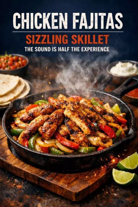 Sizzling skillet, peppers, onions, chicken. The sound is half the experience. There’s a reason every Mexican restaurant brings fajitas to the table on a screaming hot cast iron platter with steam billowing and oil popping — the sizzle is the appetizer for the appetizer. It’s theater. It’s anticipation made audible. And you can absolutely replicate it at home with a cast iron skillet and high heat.