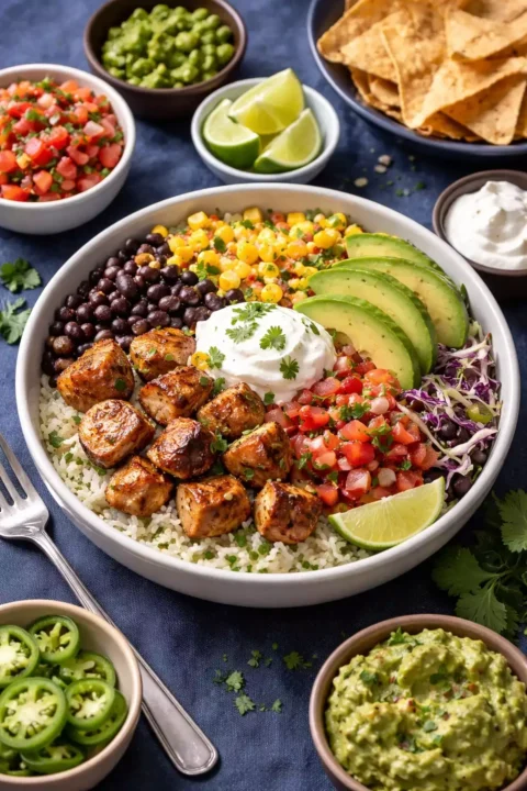 This bowl works with virtually any protein. Steak: marinate flank steak in the same adobo mixture, grill to medium, and slice thin against the grain. Carnitas: slow-cook pork shoulder with orange juice, cumin, and garlic until it shreds, then crisp under the broiler. Sofritas (for vegetarian): crumble firm tofu and sauté with adobo sauce, cumin, and garlic until browned. Barbacoa: slow-cook beef cheeks or chuck roast with chipotles, cumin, cloves, and beef broth. All of these use the same bowl base — cilantro lime rice, black beans, corn salsa, and toppings. The protein is the only variable, which means you can rotate through Chipotle’s entire protein menu using one master recipe.