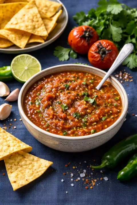If your salsa tastes flat after blending, it needs acid. Add more lime juice, a splash at a time, until the flavors brighten and pop. Acid is the most commonly under-added ingredient in homemade salsa. If it tastes too acidic (unlikely with roasted tomatoes, which are naturally sweet), add a pinch of sugar to balance.