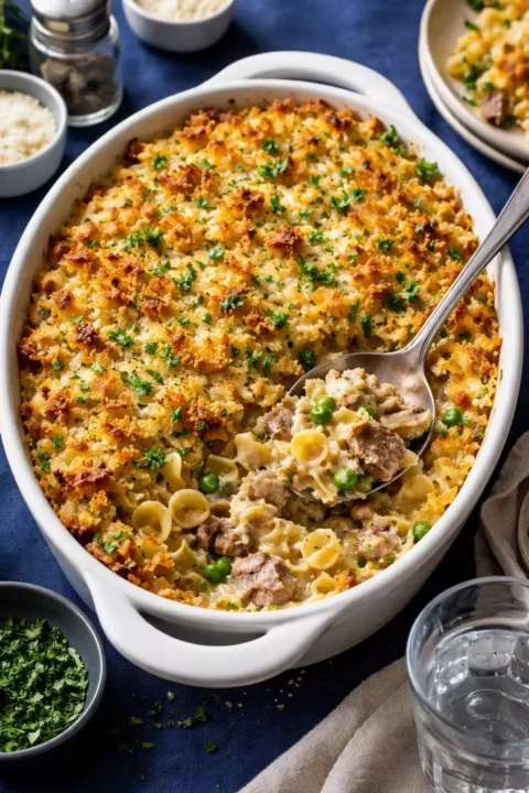For a more sophisticated version, replace canned soup with a homemade white sauce (butter, flour, milk, seasoning), use oil-packed albacore tuna instead of water-packed chunk light, add sautéed mushrooms and peas, and top with panko breadcrumbs mixed with Parmesan and melted butter. This “adult” version respects the original concept while using better ingredients that produce a noticeably more refined result.